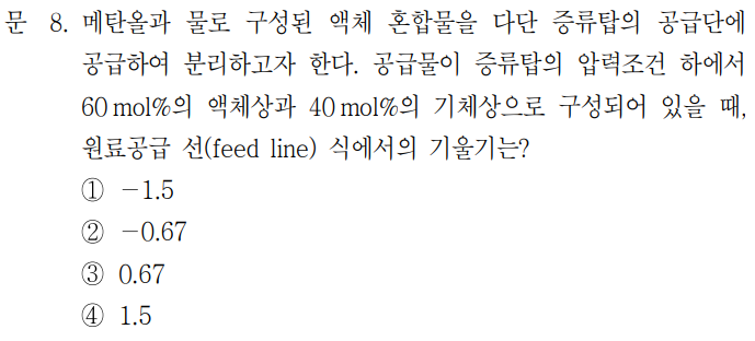 증류탑과 관련된 문제는 빈출주제로 원료공급선, q, 환류비 정도는 개념을 완벽히 알고 있어야한다.
