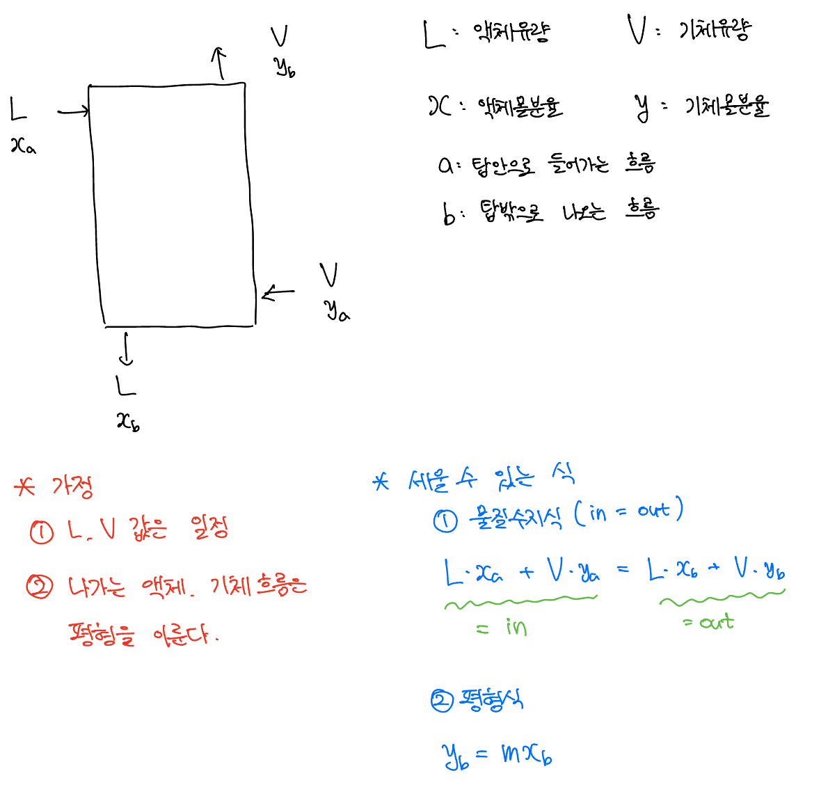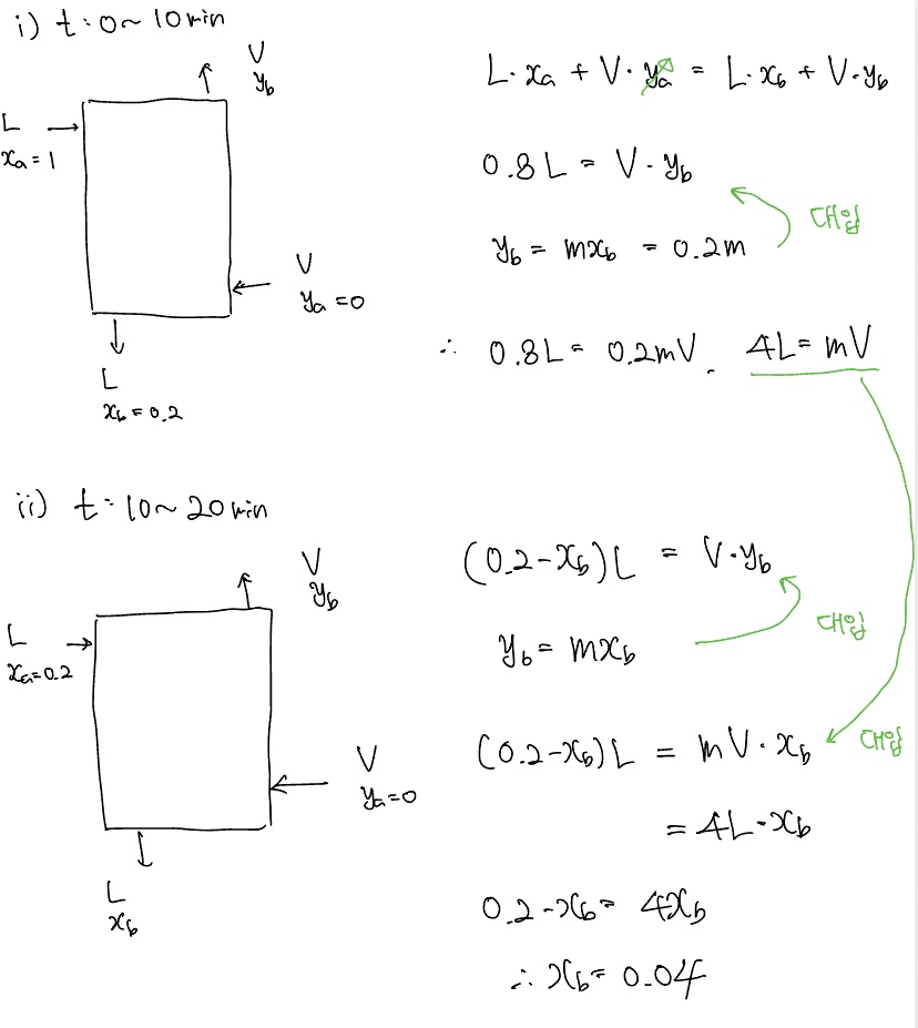 그림을 간단하게 설명하면 액체는 위에서 아래로, 기체는 아래에서 위로 흐르면서 액체와 기체간의 농도차로 인해 농도변화가 생기게되고, 그 결과가 xb, yb이다. 여기서 중요한 것은 나가는 액체, 기체 흐름은 평형을 이룬다는 것이다. 이것을 이 문제에도 적용하면 ya는 항상 0이고, 평형식의 기울기는 항상 일정하므로 yb를 xb로 표현할 수 있다. 따라서 시간이 일정하다면, 증류탑의 변수인 xa, xb의 비율은 항상 일정하다는 것이다.