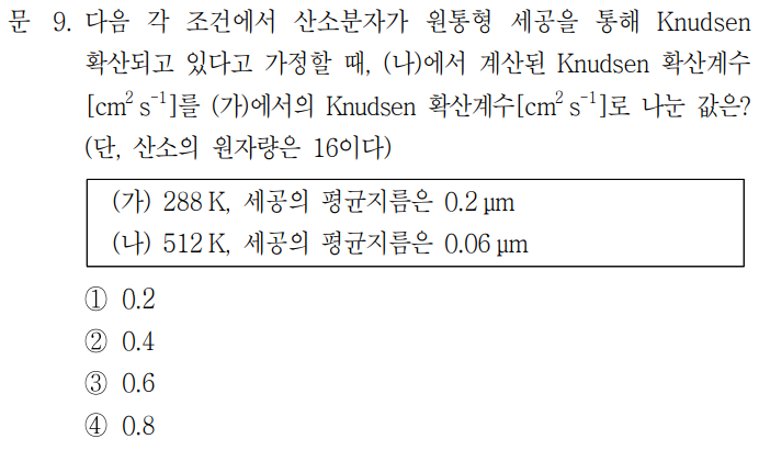 찍고 넘어갔던 문제 중 하나다. 시험장에서 생소하다고 생각했고, 처음 보는 유형이라 판단해 풀 수 없다고 생각했었다. 액-액 추출에서 나온 선택도를 이용하면 되는 문제였고, 지금봐도 시험장에서 절대 풀 수 없을 것 같다. 액체 추출뿐만 아니라 기체 막분리의 선택도도 동일한 개념을 적용하면 되는 것을 알고 넘어가면 되고, 분리막의 투과도 및 분리계수 정도는 시간이 남는다면 확인하고 넘어가면 좋을 것 같다(Mccabe 책에 관련한 내용이 있다)