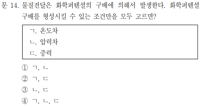 1번으로 골라서 틀렸던 문제다. 책에서 위의 문장을 봤던 수험생이 아니라면 누가 중력을 화학퍼텐셜 구배를 일으킬 수 있다고 생각했을까 싶다. 가채점하면서 너무하네 라는 생각이 들었던 문제 중 하나이며 아마 많은 분들이 틀리지 않았을까 싶다.