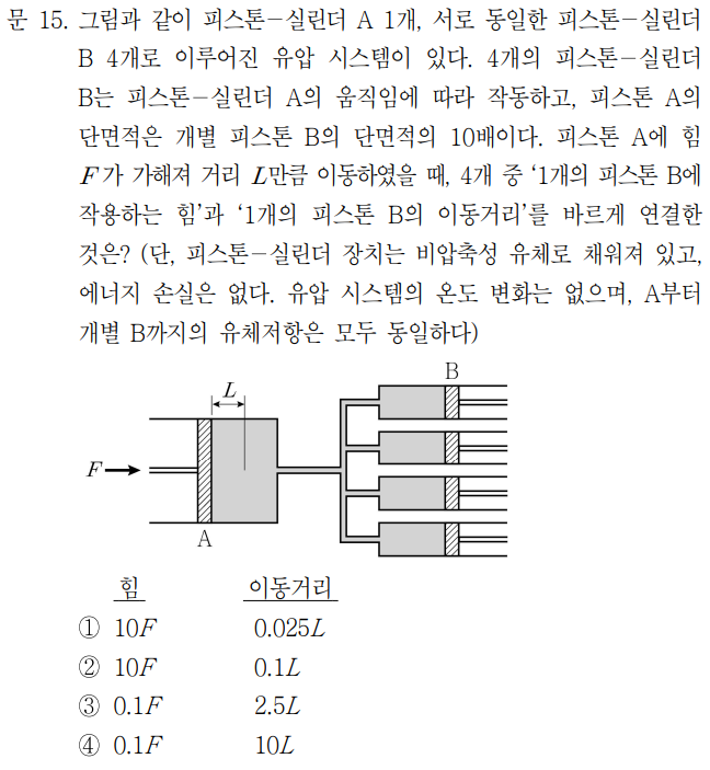 이동거리는 A와 B에서 유체가 움직인 부피가 같음을 이용한다. A가 밀어낸 유체의 양 = B의 피스톤 4개가 받은 유체의 양 이므로 A*L=4*0.1A*L' 이다. 따라서 L'=2.5L이 된다.