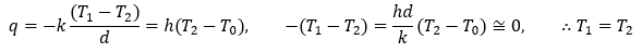 시험장에서는 위처럼 생각해 푸는것이 가장 간단한 방법인듯하다. 시간이 남는 분들은 위의 상황을 정상상태로 가정하고, 벽과 외부가 만나는 지점의 온도를 T2로 표시하고 식을 세워보길 바란다. 그럼 아래와 같이 T1=T2 라는 결론이 나온다.
