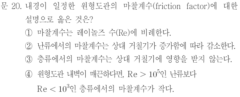 선지 4 : 선지1과 연관지어 생각한다면, 층류인 경우 마찰계수는 레이놀즈수에 반비례하기 때문에 층류에서는 레이놀즈가 작아질수록 마찰계수는 커지기 때문에 난류보다 층류에서의 마찰계수가 작다고만은 할 수 없을 것이다.
