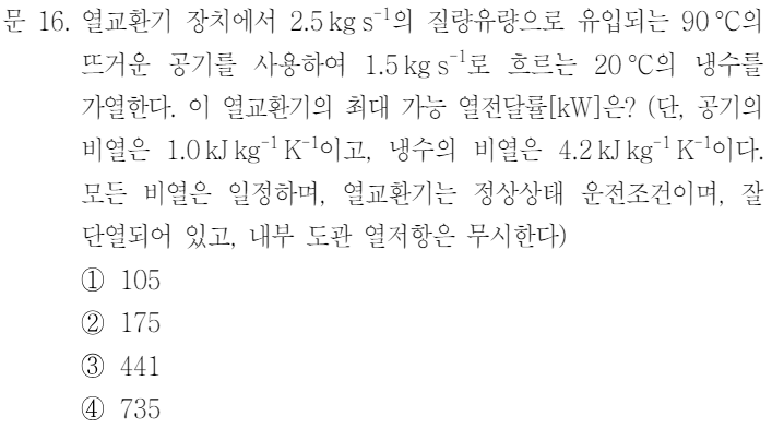 공기를 기준으로 계산한 최대 열전달률은 175kW, 냉수를 기준으로 계산한 최대 열전달률은 441kW이다. 공기와 냉수가 열전달한 양은 같다는 점을 이용해 각각의 경우에 열전달된 공기와 냉수의 온도를 계산할 수 있다. 이 온도를 계산해보면 냉수가 90도까지 올라간 경우, 공기의 온도가 20도보다 작은 숫자가 나와 이런 열전달은 불가능하다는 것을 알 수 있다. 따라서 공기가 90도에서 20도까지 낮아진 경우가 최대 열전달률이 되어 답은 175kW이다.