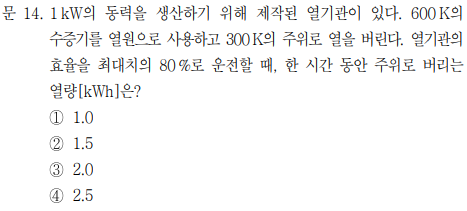 앞의 문제에서도 언급한 적이 있는데, 효율이 나오는 문제는 이상적인 것을 이용해 실제 값을 계산하겠다는 생각을 하고 있어야 한다. 문제의 열기관이 카르노 열기관이라면, 효율은 1 - 300/600 = 0.5 다. 따라서 실제 효율은 0.4이고, 동력이 1kW이므로 Qh는 2.5kW이다. 문제에서는 버리는 열량인 Qc를 물었고, Qc = Qh - W =1.5kW이다. 답은 kWh의 단위를 요구하는데, 1kWh는 1kW를 1시간 동안 사용한 에너지양을 의미하므로 그대로 1.5를 고르면 된다.