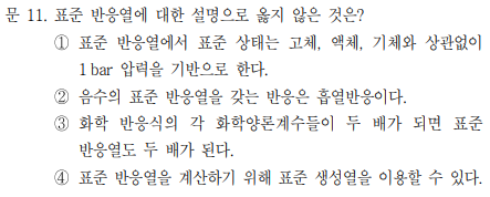 선지 2번이 너무 명확히 틀렸기에 시험장에서 2번 보자마자 바로 찍고 넘어갔다. 표준 반응열 관련 개념인 표준 생성열이나 표준 연소열도 같이 공부해두자.
