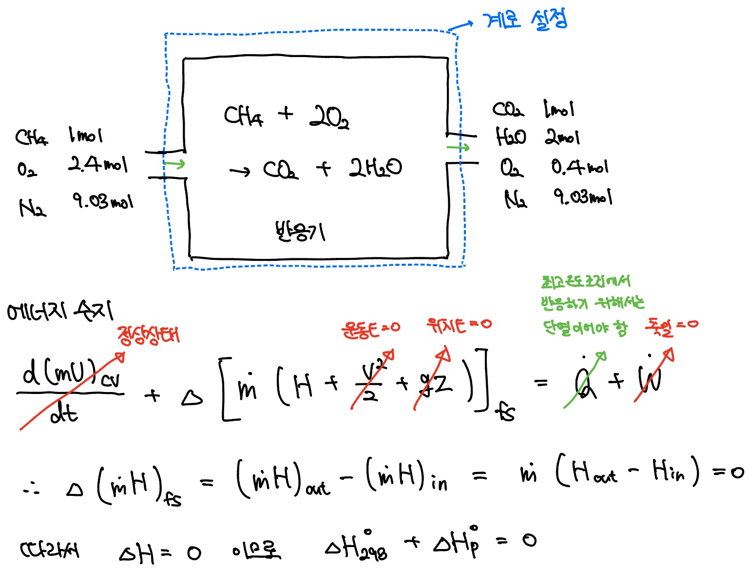 정상상태라는 언급이 문제에 없어 추가 설명을 남긴다. 정상상태란 시간의 흐름에 따라 변하지 않고 일정한 상태를 유지하는 것을 의미하는데, 문제에 주어진 양만큼의 반응물이 계로 들어가면 항상 정해진 생성물의 양만큼 나오게 된다. 따라서 투입량이 변하지 않는 이상 생성량도 변할 일이 없고, 이를 정상상태라고 볼 수 있다.