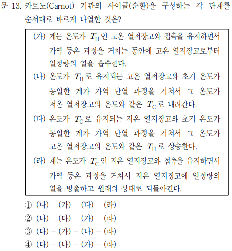 열기관 작동 순서에 관한 문제다. 카르노 사이클은 "가역단열 > 등온(Th) > 가역단열 > 등온(Tc)" 순으로 작동하므로 이에 해당하는 순서만 고르면 된다.